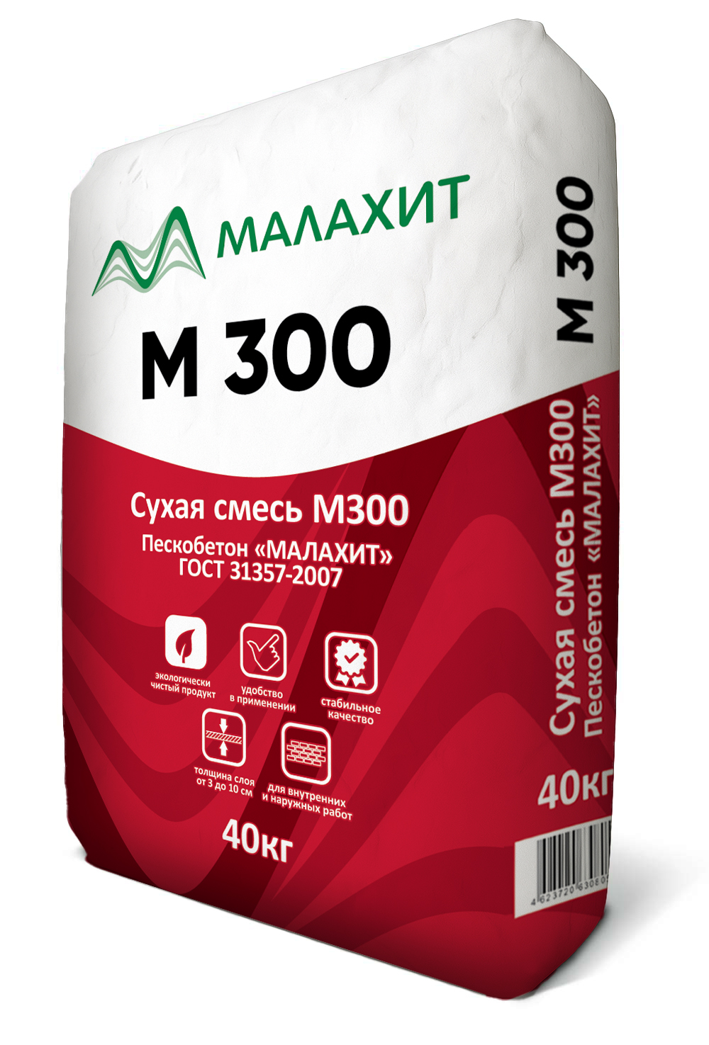 Смесь пескобетон М300 имеет в своем составе цемент марки ПЦ500ДО/ ПЦ400ДО, фракционный песок (фракция до 6 мм), а также специальные добавки, которые позволяют сделать готовый раствор более пластичным, быстросохнущим и износостойким. Благодаря свойствам, полученным вследствие длительных исследований и экспериментов, сухая смесь М300 от ТМ “Малахит” применяется для устройства высокопрочных износостойких полов в качестве несущего слоя в подвалах, гаражах, мастерских, производственных цехах, а также при осуществлении монтажных работ.